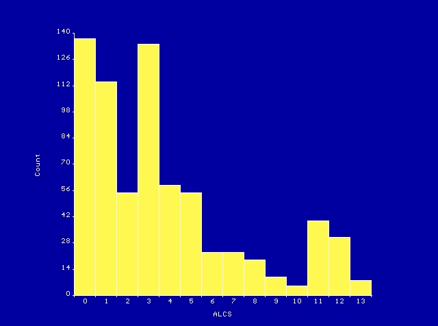 (A) Univariate. The mean alcohol consumption score is 3.7, standard deviation = 3.6, n = 713. The five-point summary: 0, 1, 3, 5, 13. Click here for the histogram. This histogram shows data to have a pronounced positive skew with modes at 1, 3, and 11.
