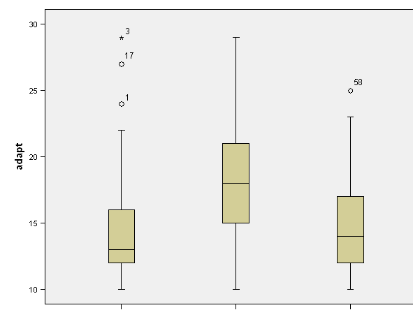 (A) Explore the data with side-by-side boxplots. The SPSS boxplots are shown below. (The labels on the X-axis failed to print in the transfer to html. Here are the group descriptions we are going to have to keep in mind when interpreting these data: Group 1 = LBW + intervention, Group 2 = LBW + no intervention, Group 3 = normal birth weight, no intervention.)