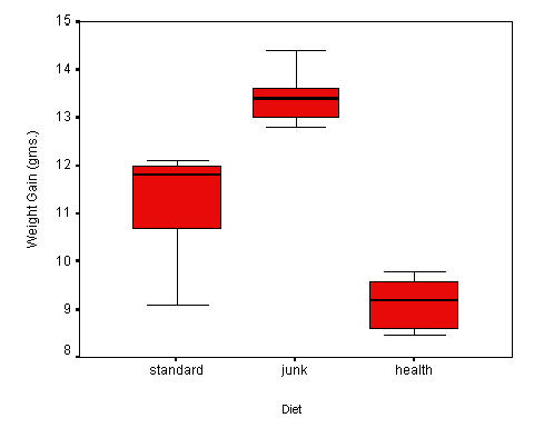 12.1 Weight gain and junk food. The dependent variable is weight gain (grams) and the independent variable is diet type (1 = standard diet, 2 = junk food, 3 = health food). The study was done in laboratory mice (for obvious reasons); there are 5 mice per group (small sample). The study was set up to learn about the effect of diet on weight gain.