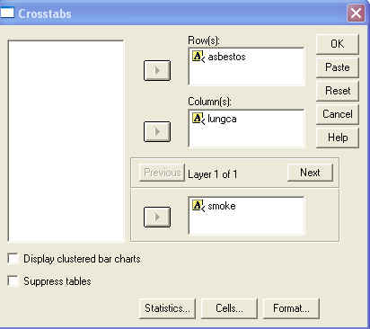 (C) Cross-tabulate LUNGCA by ASBESTOS stratified by SMOKE. This is accomplished by filling in the SPSS dialogue box as shown below. Calculate the odds ratios for smokers and non-smokers separately. Are these odds ratios homogeneous? What is the effect of asbestos in smokers? ... in non-smokers?