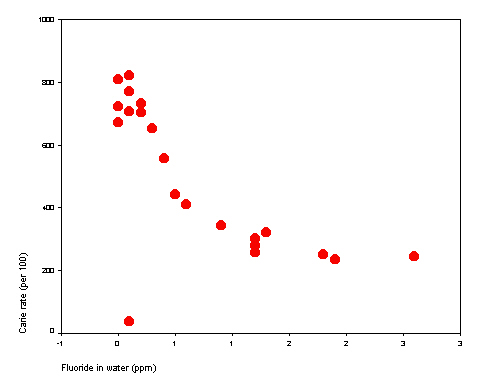 Any outliers? Yes. Lower left quadrant -- a city with low fluoride and