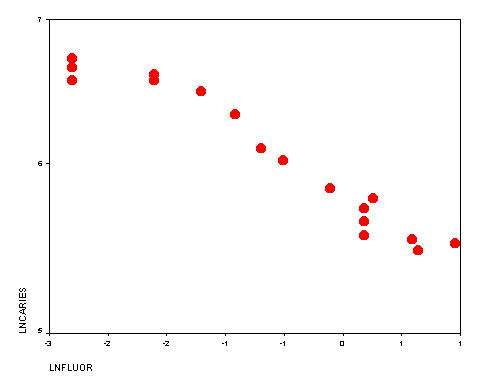 Interpretation: Relation linear? Not perfectly, but good enough for descriptive purposes. Correlation statistics: . Regression model: Comment: Although the fit of this model is not as good as model B, I prefer no model. The untransformed figure shows most clearly that the decline in cavity rates is steep in the 0 to 0.8 range. Since higher levels have only modest increases in benefit and potential toxicity, any action should be devoted to adding less than 1 ppm of fluoride to public water sources. |