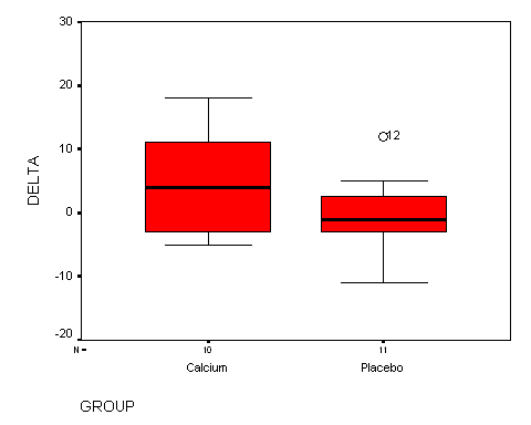 11.11 The effect of calcium supplementation on blood pressure. See the boxplot shown below. Notice that the calcium-supplemented group has a higher average and (perhaps?) more variation. Also notice the outside value in the placebo group.
